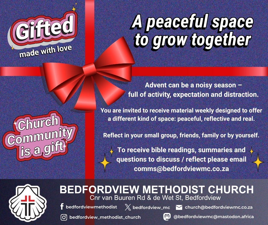God calls Bedfordview Methodist Church to proclain the Gospel of Jesus Christ for healing and transformation.